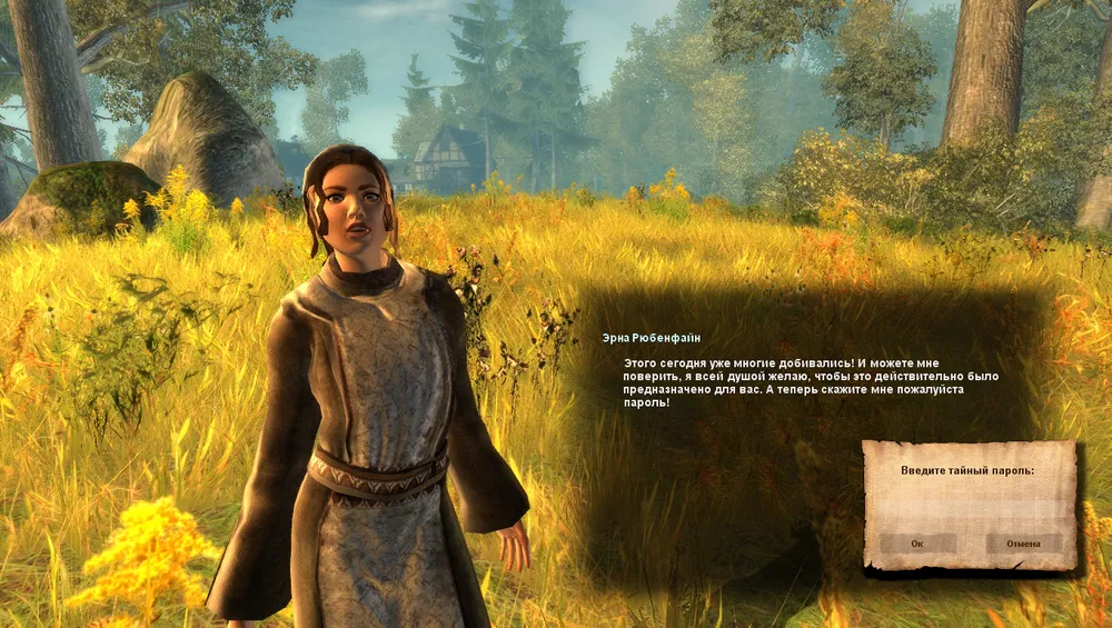 Слева от главной дороги прямо за деревенькой, на небольшой полянке прогуливается крестьянка – Эрна Рюбенфайн. Если начать с ней разговор, то она отправит вас к своему мужу, однако можно спросить ей о некой вещи, которая принадлежит нам. Она попросит назвать пороль. Набираем один из этих кодов: