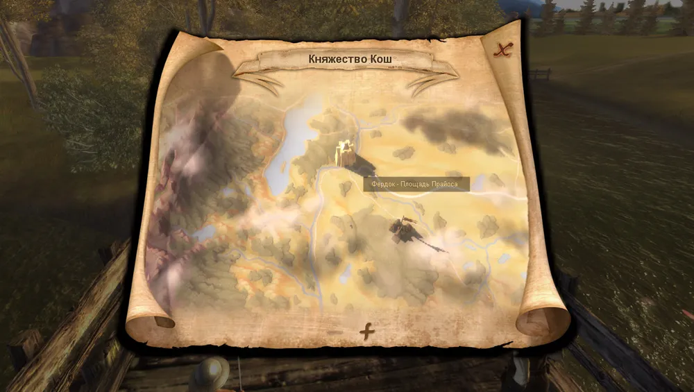 В верхнем правол углу локации, у водопада можно найти странный труп, вокруг которого летают огненные мухи. Разделываемся с мухами и обыскиваем труп. На нём можно найти ключ и записку, в которой упоминается сундук с сокровищами. Сам сундук находится слева от тела(если стоять лицом к водопаду) за кустами. В нём лежит 3 дуката, золотая цепочка и серебряное кольцо. Весма неплохие сокровища для начала игры.