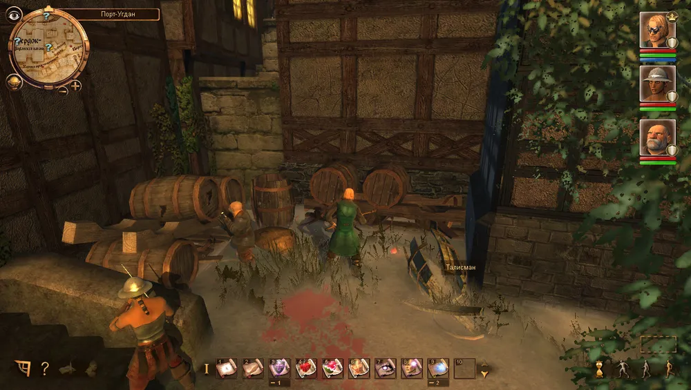 Опрашиваем посетителей таверны. К сожалению никто из них не может нам помочь. Однако на выходе из «Ловкого Хорька» официантка Алина останавливает нас и рассказывает, что Ташмман оказывается запретил ей и остальным посетителям говорить что-либо о смерти «Дракона», поэтому она и не разговаривала с нами в таверне, но теперь, пока никто не видит она готова сказать нам всё что знает. Алина подозревает что «Дракона» убили из-за его талисмана. Он всегда носил его с собой, но когда нашли тело талимана на нём не было. Поблагодарив официантку идём осматривать место преступления. Талисман о котором рассказывала Алина, оказывается не пропал, а по какой-то счастливой случайности попал в рядом стоящюю бочку.