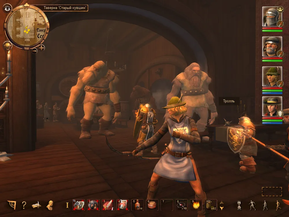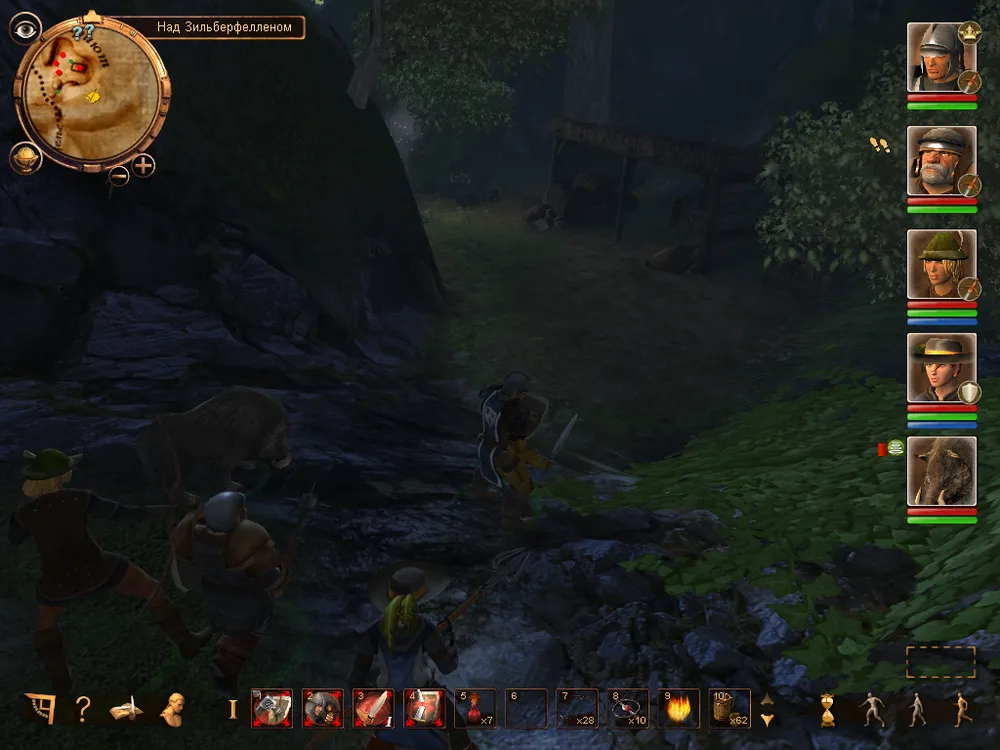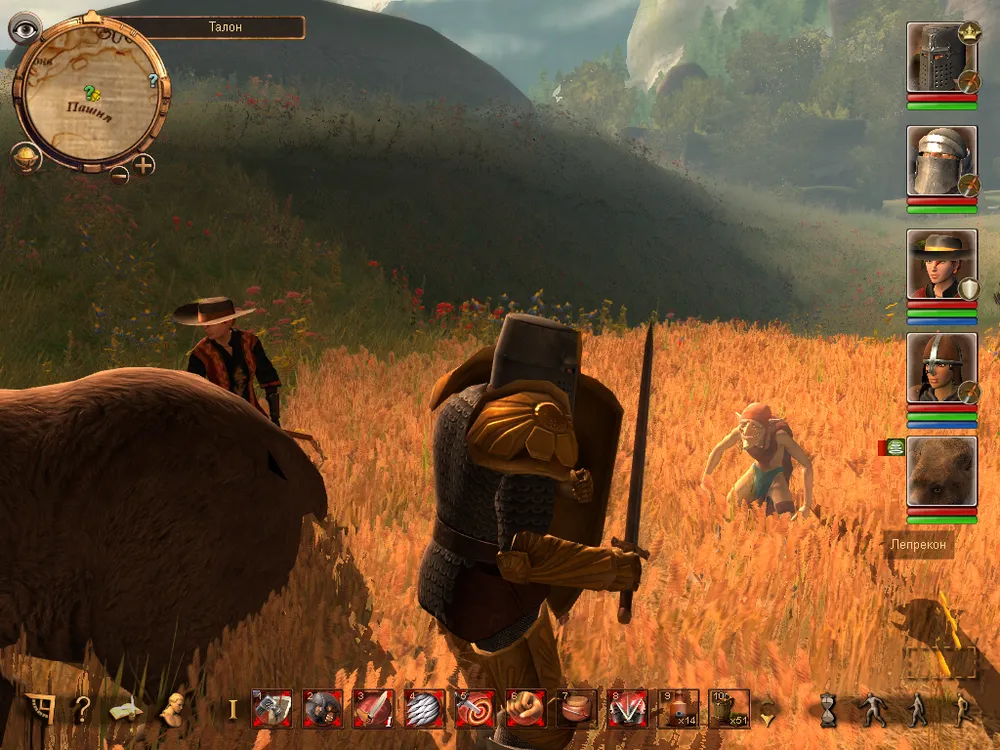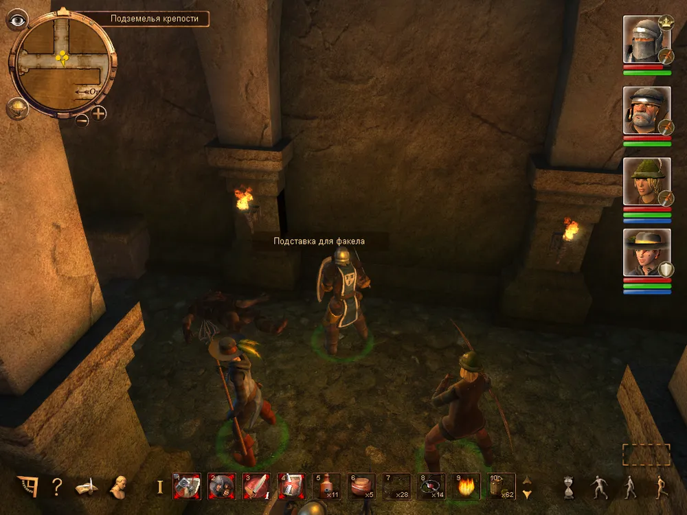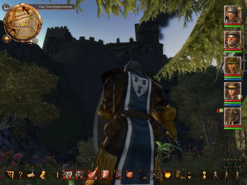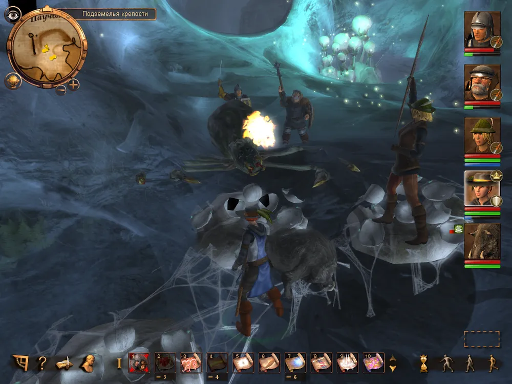 Итак, перед нами RPG, в которой под нашим управлением находится до 4 персонажей (плюс вызываемые существа), а битвы проходят в реальном времени с возможностью использования активной паузы (нажимаем "Пробел", отдаём указания всем персонажам и повторное нажатием на клавишу возобновляем битву). Естественно в наличии панель быстрого доступа, куда следует переносить активные боевые умения/магические заклинания, а также зелья и т.д., можно использовать несколько панелей быстрого доступа (если всё не умещается в одну) для этого просто используем прокрутку вниз/вверх. Боевая система довольно запутана и для того, чтобы разобраться в ней придёться потратить некоторое время (игра делалась по одноимённой настольной немецкой РПГ и данный элемент разработчики не смогли доходчиво объяснить игроку), так что вместо урона от оружия нам показывают 1W+2, 1K+4 и т.д.
