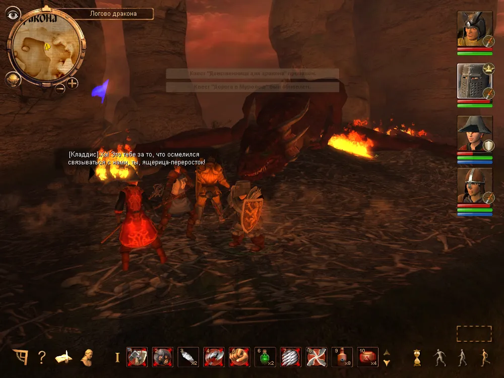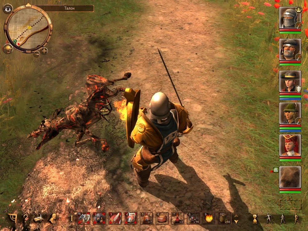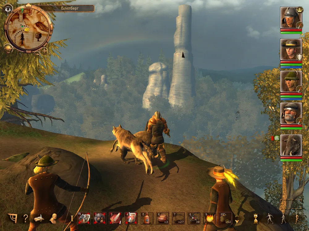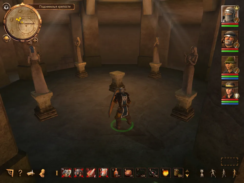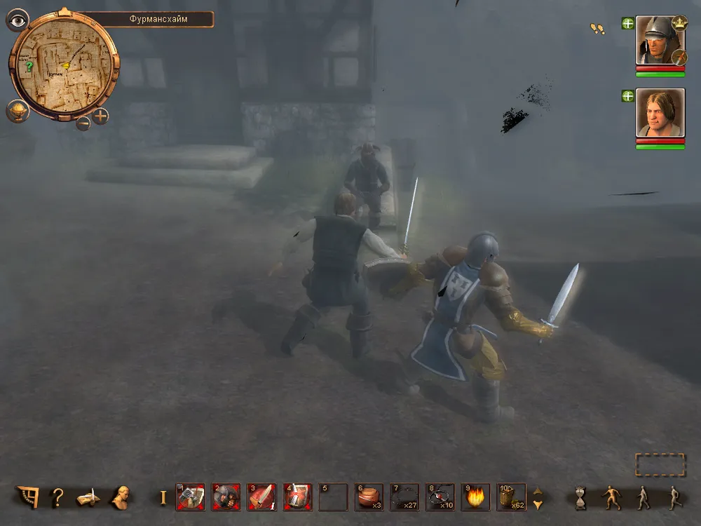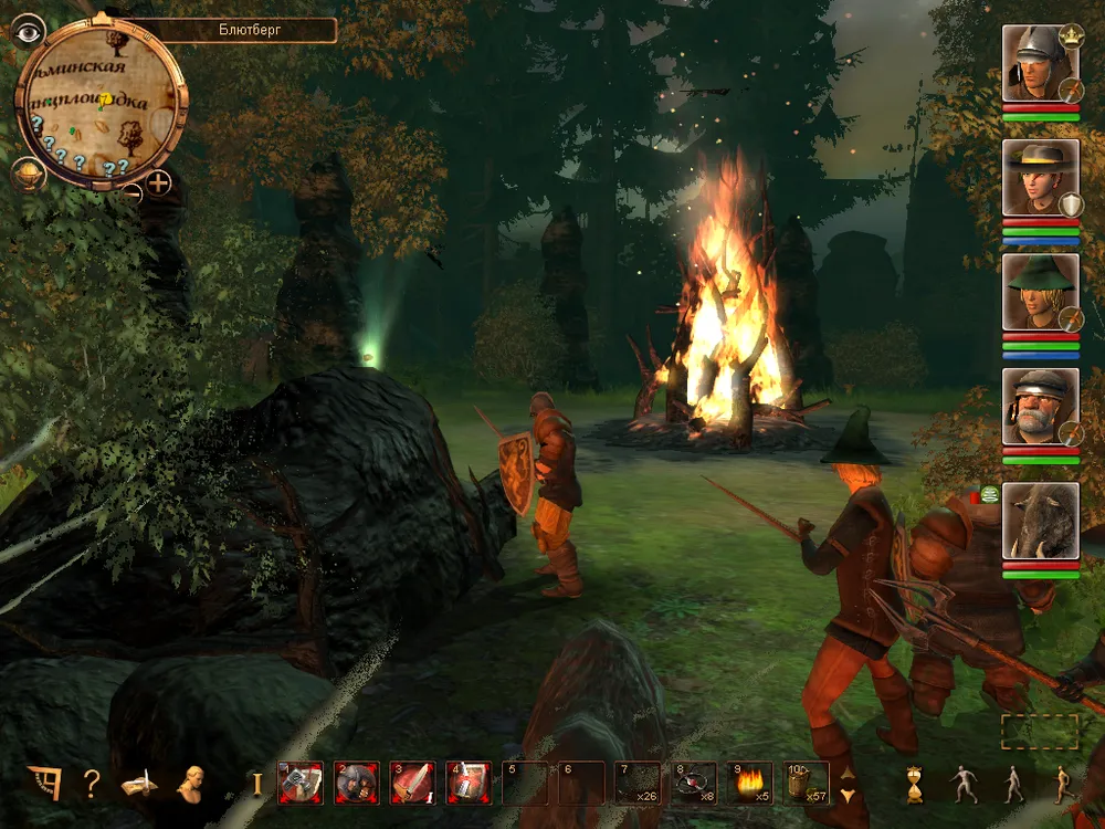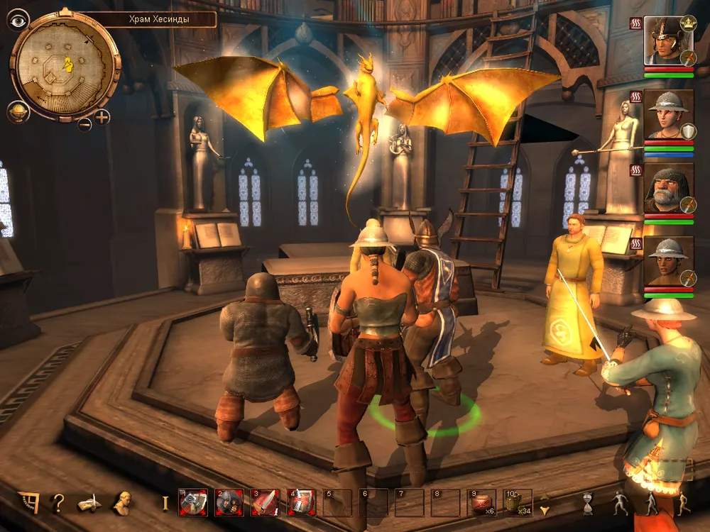 Итак, перед нами RPG, в которой под нашим управлением находится до 4 персонажей (плюс вызываемые существа), а битвы проходят в реальном времени с возможностью использования активной паузы (нажимаем "Пробел", отдаём указания всем персонажам и повторное нажатием на клавишу возобновляем битву). Естественно в наличии панель быстрого доступа, куда следует переносить активные боевые умения/магические заклинания, а также зелья и т.д., можно использовать несколько панелей быстрого доступа (если всё не умещается в одну) для этого просто используем прокрутку вниз/вверх. Боевая система довольно запутана и для того, чтобы разобраться в ней придёться потратить некоторое время (игра делалась по одноимённой настольной немецкой РПГ и данный элемент разработчики не смогли доходчиво объяснить игроку), так что вместо урона от оружия нам показывают 1W+2, 1K+4 и т.д.