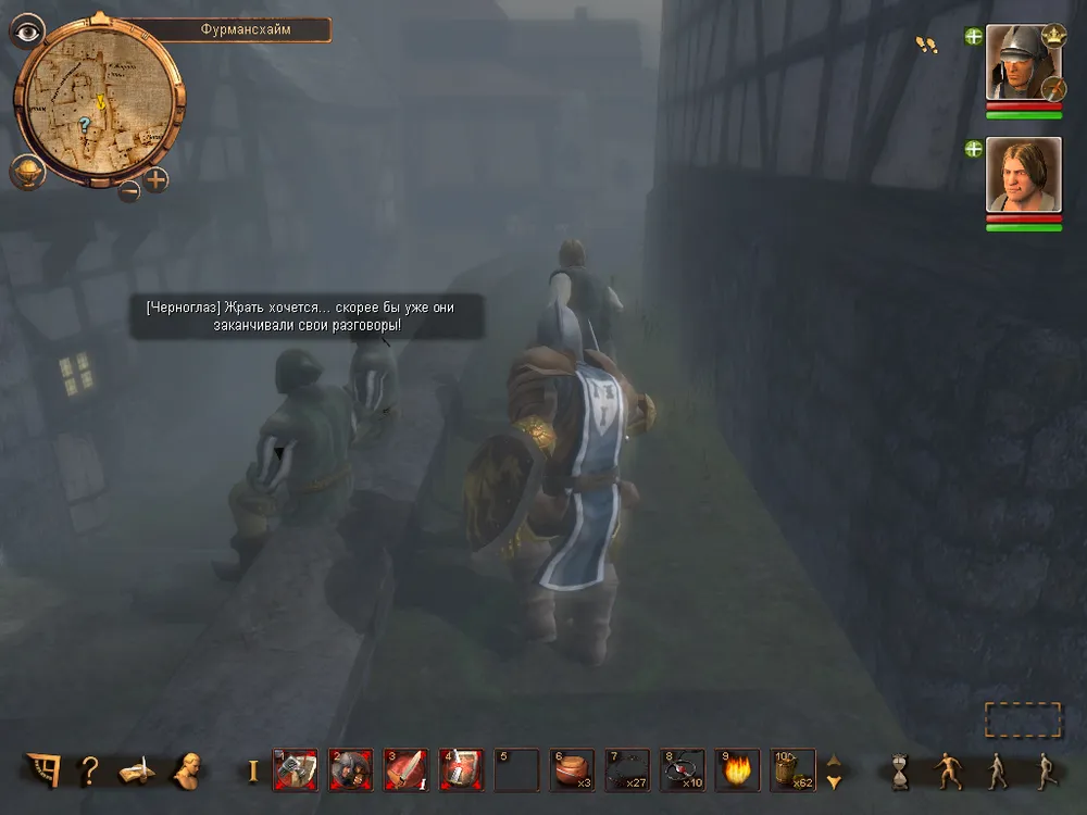 Начитается наш путь в Фердоке с беседы с весьма упитанным господином, который не только рассказывает о тайной тропе, но и советует взять себе нового спутника, которого внимательные игроки могли видеть в порту с самого прибытия в Фердок, он готов присоединить к нам за 200 дукатов - боец ближнего боя; брать с собой я его не стал, так как не мог расстаться с гномом, снял только наплечники с него.